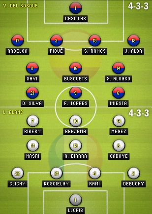 اما ابناء المدرب لوران بلان يواجهون هذه المباراة مع غياب مدافع نادي الميلان فيليب ميكسيس. اما اسبانيا تصل لهذه المباراة بدون غيابات. ولكن هناك تخوف وحيد لدى كلا المنتخبين لان عده لاعبين هم في خطر عن الغياب في مباراة الدور نصف النهائي ضد السيليساو الأوروبي، من جانب اسبانيا: أربيلوا، ألبا، ألونسو، توريس وخافي مارتينيز اما فرنسا مينيز وديبوشي.
