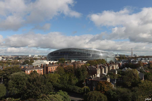 استاد “أفيفا” الذي يقع في العاصمة الآيرلندية – “دبلن”، وهو يتميز بتصميم دائري لسقف الملعب بما لا يعوق مرور آشعة الشمس إلى المباني السكنية المحيطة.