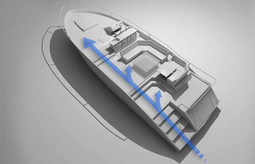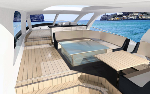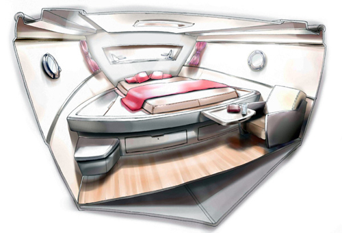 اليخت يبلغ طوله نحو47 قدماً، ذو سطح زجاجي يسمح بدخول أشعة الشمس، كما أن التصميم الداخلي للغرفة جاء ذكياً لأنها احتوت على أفضل أنواع الأثاث العصري الذي يستخدم كحلول للغرف الضيقة فيخلق موازنة بين تأدية الغرض والذوق وخلق المساحة.