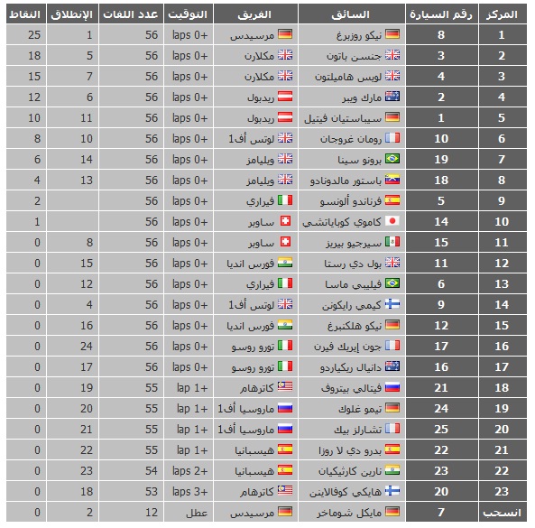 - حقق نيكو روزبرغ إنتصاره الأول في سباق فورمولا1. ورفع رصيده في عدد المنصات الى 6. كما يُعد روزبرغ السائق رقم 103 الذي يحقق إنتصاره الأول في الفئة الأولى.