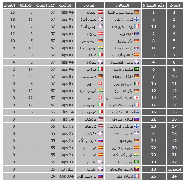 وجاء الأسترالي مارك ويبر في المركز الرابع أمام سائق مرسيدس نيكو روزبرغ الذي أنهى السباق من مكان إنطلاقه – المركز الخامس.