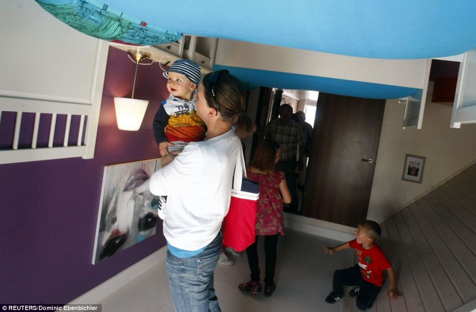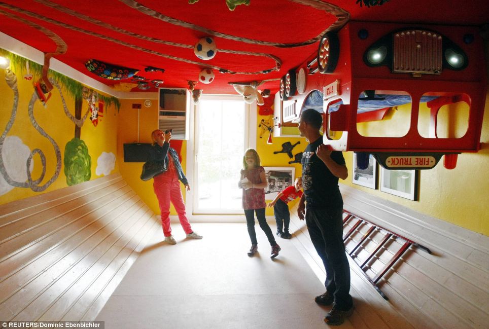 ويستطيع السائح دخول المنزل من نافذة “الطابق العلوى”، وبتفقد غرف المنزل، يجد غرف نوم الأطفال، وقد تم تثبيت اللعب ومتعلقات الأطفال بالأعلى، وغرفة المعيشة ويبدو بها التليفزيون مثبتا على منضدة مثبتة أيضاً بالأعلى ويجد مدفأة تعمل- على الرغم من أن مدخنة المدفأة فى باطن الأرض.