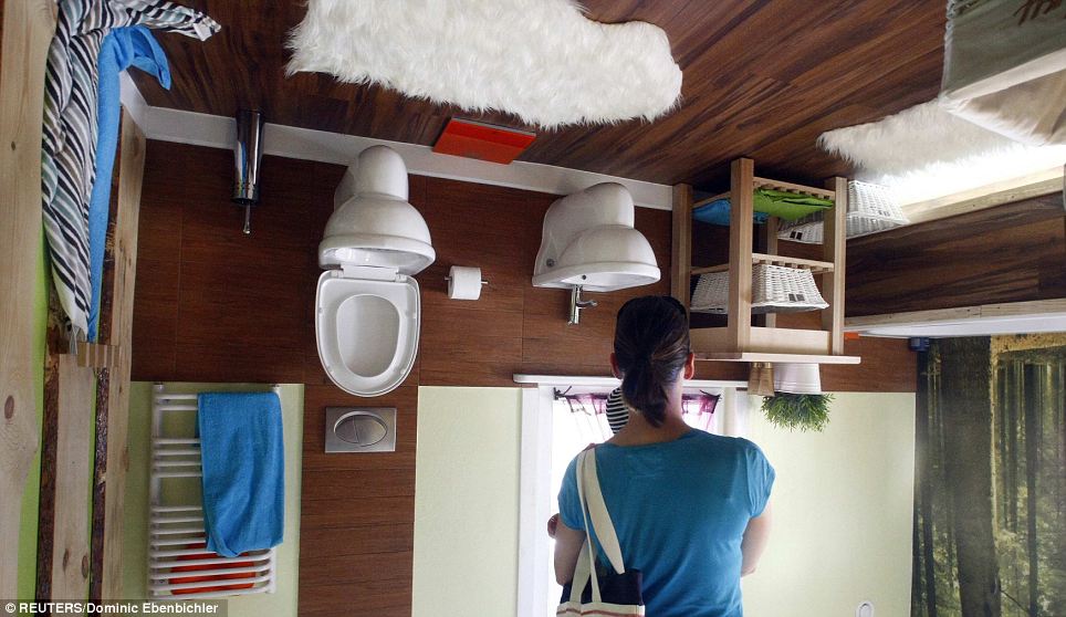 وذكرت الصحيفة أن الزائر عند دخوله الحمام يجد كافة المتعلقات، وقاعدة الحمام مثبتة بالأعلى وعند دخول المطبخ، يجد كافة أدوات المطبخ مدلاة من أعلى وقد تم تثبيت الفرن بالسطح.