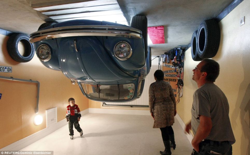 ويستمر اندهاش الزائرين عند تفقد الجراج وغرفة تصليح السيارات، التى تتحدى الجاذبية بحيث تحتوى على سيارة “فولكس فاجن” تم تثبيتها بالأعلى مما يثير الإعجاب بدقة التصميم والتنفيذ.