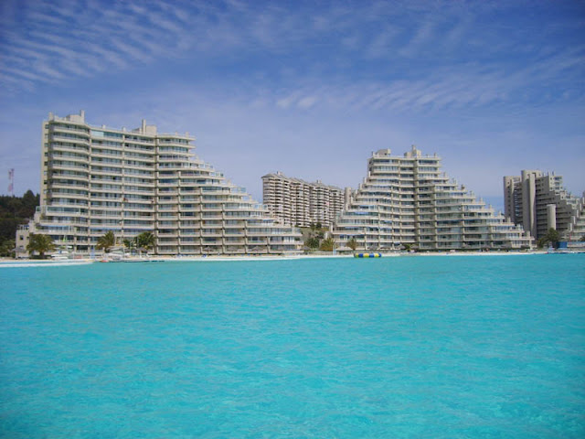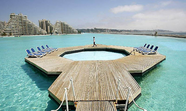 على مساحة إجمالية تبلغ 8 هكتارات (19.77 فدان)، يقع أكبر حوض سباحة في العالم في منتجع سان الفونسو ديل مار في تشيلي ويعد هو الأكبر في العالم. حيث كان مدرجاً رسميا على أنه اكبر حوض سباحة من حيث المساحة في كتاب غينيس للارقام القياسية العالمية في ديسمبر كانون الاول من عام 2006. يحتويعلى 250 مليون لتر (66 مليون غالون) من الماء، وهو ما يعادل حوالي 6000 متر. تقع على بعد حوالي 90 كيلومترا (56 ميلا) من سانتياغو، سان ألفونسو ديل مار هو من المعالم السياحية الرئيسية، ومقصدا لكل من التشيليين والسياح من مختلف أنحاء العالم. إليكم الصور