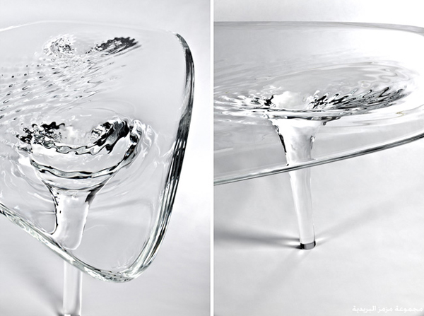 قامت زها حديد، المصممة البريطانية العراقية الأصل بإبتكار طاولة قهوة إبداعية يصل ثمنها إلى 160 ألف دولار، وهى مصنوعة من ألياف الأكريليك الشفاف حيث تقوم بمحاكاة المياه المتدفقة على الأرض بشرط أن تكون صافية ونقية جداً، والسيقان الستة وكأنها ستة جداول تشبه الدوامات وتصعد من الأسفل نحو السطح إضافة إلى الإنكسار المتقن وترشح هذا التصميم إلى جائزة متحف “لندن للتصميم 2013″ في قسم المفروشات، والتي سيتم تحديد الفائزين فيها يوم 17 أبريل 2013 ويبلغ إرتفاع الطاولة 750 مم ويمكن فصلها إلى طاولتين صغيرتين، تجدر الإشارة إلى أن زها حديد هى أول إمرأة تحصل على جائزة “بريتزكر” المعمارية.