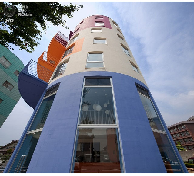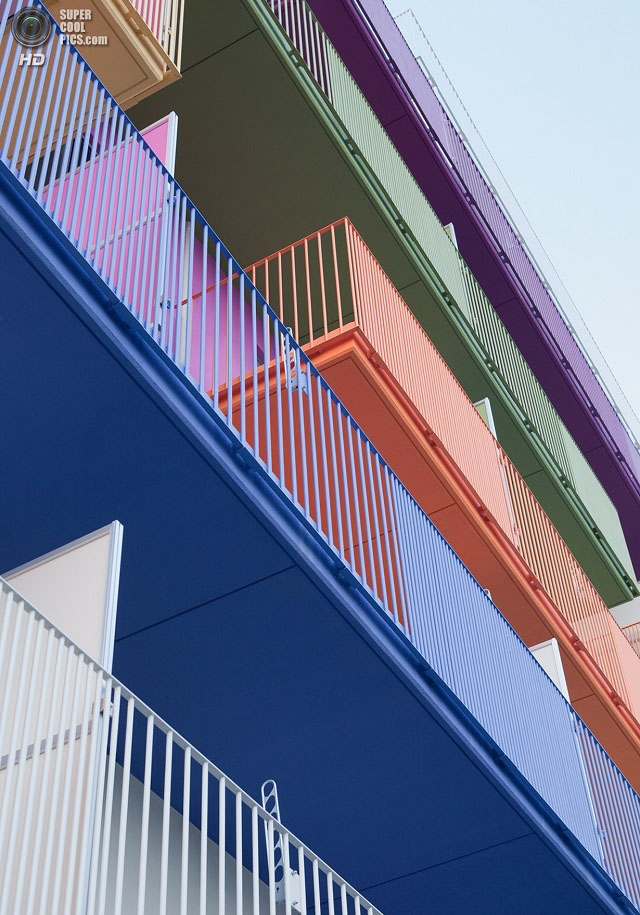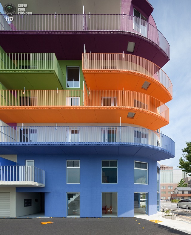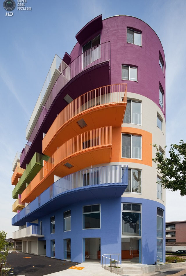 فالمهندسون المعماريون في المدينة اليابانية أوكازاكي تركوا هذه الممارسة والروتين القديم وزينوا كل طابق من مبنى سكني جديد بلون خاص به من ألوان قوس قزح ليضيفوا البهجة إلى هذه الضاحية الكئيبة ولكسر النمط السائد في ألوان المباني