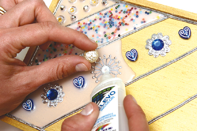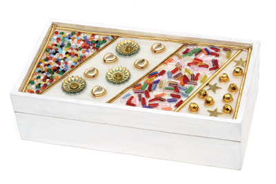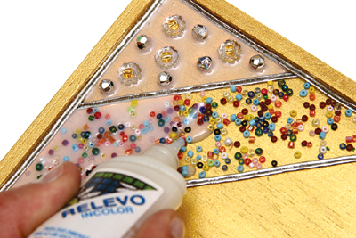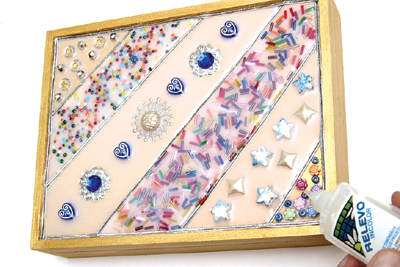 3- ابدئي بتزين الصندوق وذلك بوضع الخرز بداخل ثم تعبئته بالصمغ