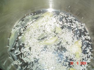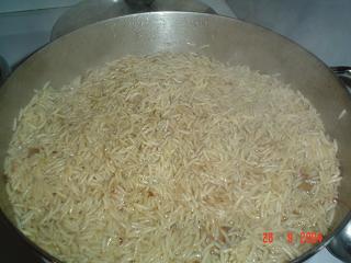 و توضع على نار عالية الى ان تقل كمية المرقة و تصل تحت الارز بقليل .تخفف الى نار هادئة