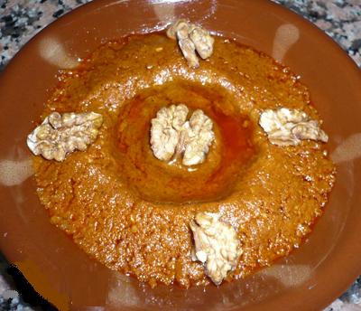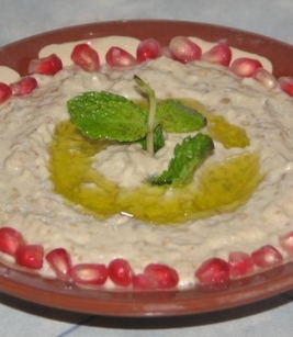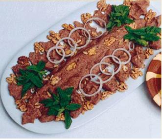 شكلي تصاميم على سطح الكبة بواسطة الشوكة ثم صبي عليها الزيت بشكل دائري وزينيها بالجوز والصنوبر وريقات النعناع