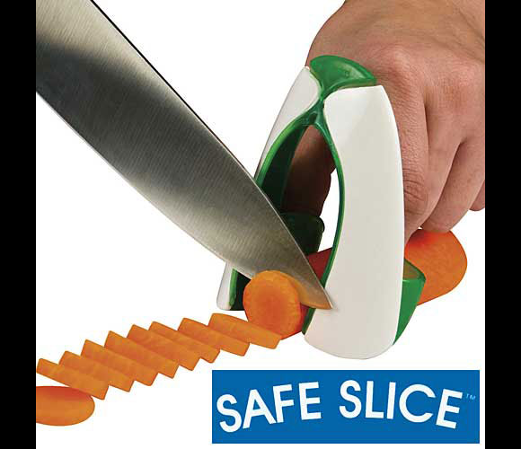 لأن عملية قطع الخضروات والفواكه معقدة جداً وتحتاج إلى تدريب (أمزح بالطبع!) قامت أحد الشركات بتصميم هذا المنتج الذي يقف حائلاً بين السكين وأصابعك لتستطيع قطع الخضروات والفواكه وأنت مغمض العينين! والسعر 5.98 دولار