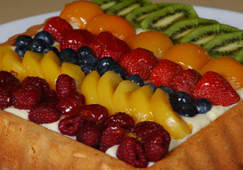 - تٌترك لتبرد و تُزين بالكاسترد و الفاكهة الطازجة ، و تُدهن بالمربى المُخففة بالماء
