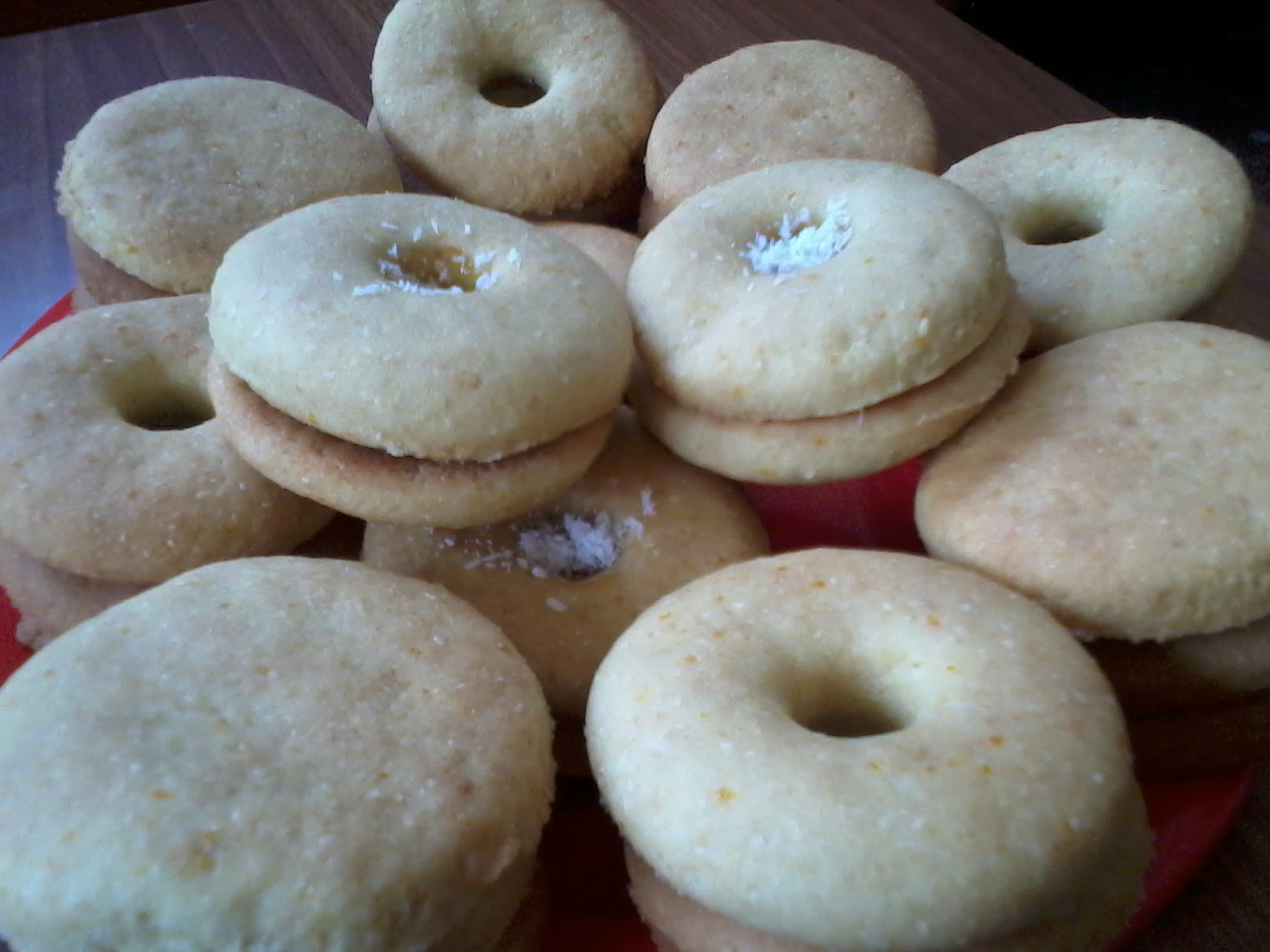 يذاب السكر جيداً في عصير البرتقال ثم يضاف الزيت وبرش البرتقال ويخفق جيداً بالخلاط أو الخفاقة الكهربائية حتى يصبح الخليط كريمي ثم يضاف جوز الهند ويخفق قليلاً، ويوضع المزيج الناتج فوق الطحين المنخول والمخلوط مع البيكنغ باودر ويعجن حتى تتماسك العجينة، ثم ترق بواسطة الشوبك وتقطع حسب الرغبة ... أو تجهز بقوالب البسكوت... توضع في فرن حامي حوالي 200-250 درجة مئوية حتى تزهر قليلاً ... يمكن حشوها بالمربى بعد أن تبرد وتلصق كل قطعتين من البسكوت مع بعض.