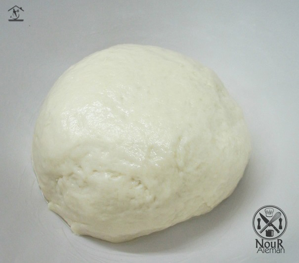 2- نلمّ العجـــين ونجعلها ترتاح في طبق مدهون بالزيت و نرشها بزيت ونتركها في مكان دافئ تتخمّر.