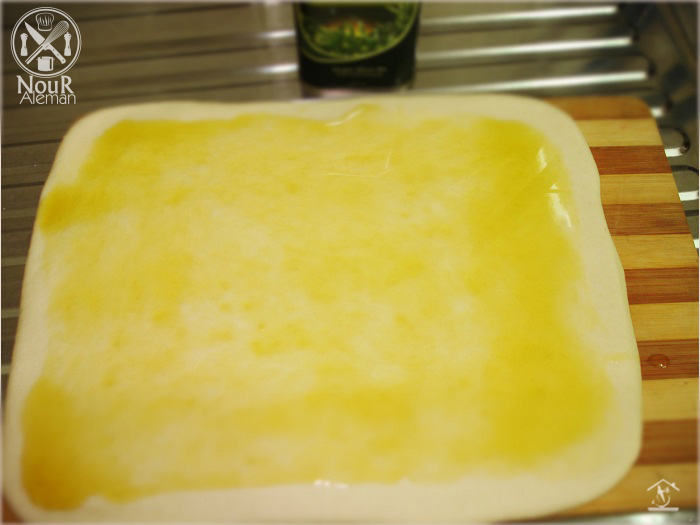 4- نضع زيت الزيتون ونوزعه على العجين بالفرشاء