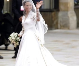 بدت كايت عروساً خجولةً سعيدة بعريسها، وقد تألقت بثوبها المشغول يدوياً من الحرير والدانتيل الانكليزي والذي حمل توقيع دار مصمم الأزياء الراحل "ألكسندر ماكوين" تحت إدارة المصممة سارة بورتون التي تعاونت مع كايت لإنجازه.