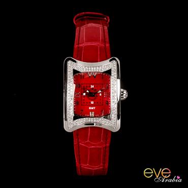 ساعة يد مصنوعة من الجلد الأحمر اللون, ومرصعة بالفصوص الألماس الصعيرة البيضاء اللون, وتصلح لجميع النساء فى كل الأوقات