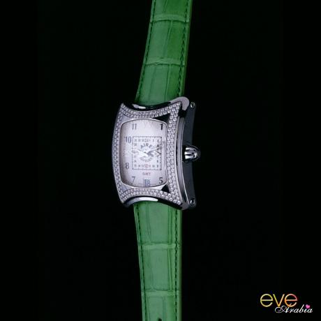 ساعة يد مصنوعة من الجلد الطبيعى الأخضر اللون, مرصعة بفصوص الألماس الصغيرة البيضاء اللون, وتصلح للنساء والفتيات فى كل الأوقات