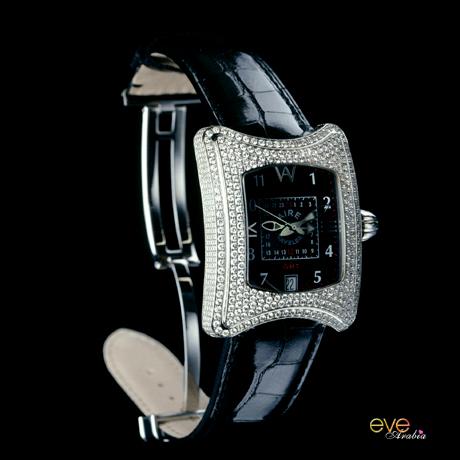 ساعة يد مصنوعة من الجلد الطبيعى باللون الأسود, مرصعة من الوسط بفصوص الألماس الصغيرة باللون الأبيض, وتصلح لكل النساء فى جميع الأوقات