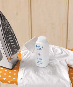 قبل الكيّ رشي من البودرة تحت الإبطين والياقات حتى تعمل حاجز وتساعد على منع تسرب العرق والأوساخ