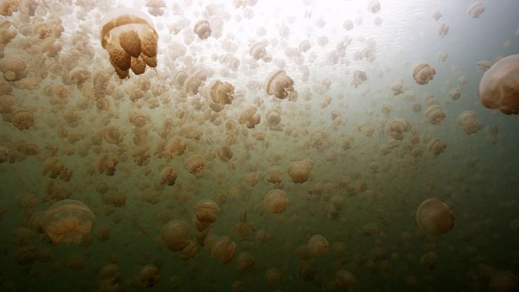 غواص في بحيرة مليئة بقناديل البحر، جزر كارولين. جمهورية بالاو.