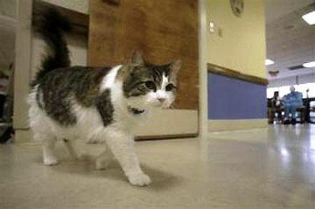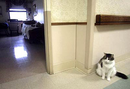 وعندما يلاحظ الاطباءجلوس القط قرب فراش احد المرضى يسارعون باستدعاء اهل المريض لكي يودعونه لانه سيموت في فترة اقصاها 4 ساعات.الخبراء في شؤونالحيوانات قالوا بأنهم يعرفون قدرة بعض الحيوانات على شفاء ومساعدة المرضى بل والتنبؤ بالزلازل قبل وقوعها بدقائق .. لكنهم محتارون بامر هذا القط العجيب الذي يقترب من الشخص الذي يقارب على الموت خلال ساعات ويبقى قربه حتى يلفظ انفاسه الاخيرة.
