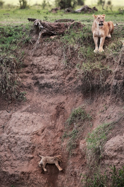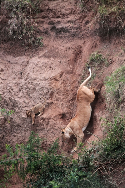 التقط المصور جان فرانسوا على لحظات أمومة مذهلة لأنثى الأسد تعبر عن التضحية وحب الأم فى جميع الكائنات، داخل غابات كينيا وفقا لصحيفة ذى صن البريطانية.وأظهرت أنثى الأسد شجاعة بالغة فى مواجهة منحدر رأسى تقريبا لإنقاذ ابنها الذى ضل عن الطريق، بعد أن انفصل عن القطيع لتجده عالقا على منحدر يواجه الموت لتختار هى أيضا بكامل إرادتها أن تواجه الموت لتنقذ ابنها.وشقت الأنثى طريقها داخل المنحدر ثم أمسكت الشبل بفكيها لتتسلق المنحدر وهى تحمله، وبمجرد أن وصلوا إلى الآمان أعطت الأم لشبلها جرعة من الحنان وداعبته لتطمين ابنها الذى كان على حافة الموت.