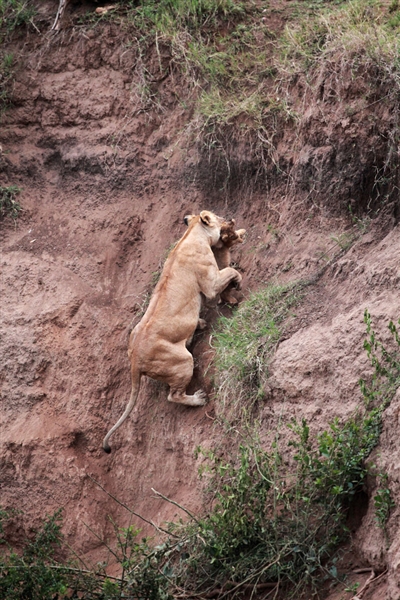 • أمومة أنثى الأسد تجعلها تتحدّى قوانين الجاذبية لإنقاذ شبلها