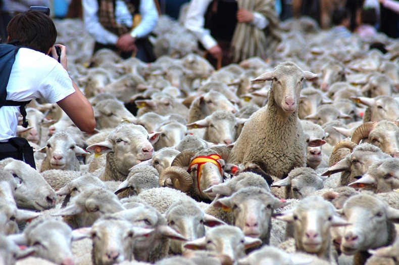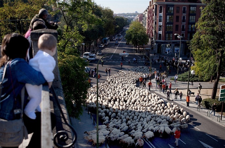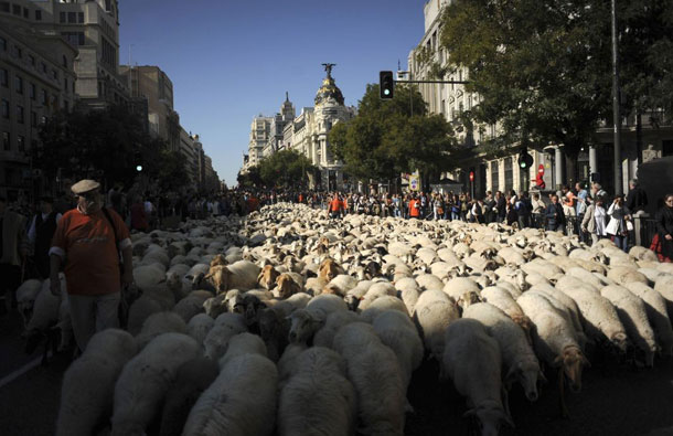 قاد رعاة الأغنام فى أسبانيا العديد من قطعان الأغنام بوسط شوارع العاصمة الأسبانية مدريد أول أمس الأحد، للدفاع عن حقوق الرعى المهددة من قبل الزحف العمراني والحدود التي صنعها الإنسان، حيث وصل عدد الماشية حوالي 5 آلاف خروف و60 رأسا من الماشية.