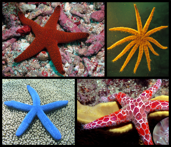 توجد منها حوالي الـ 2000 فصيلة و معظم نجوم البحر تكون بخمسة أذرع ولكن منها من له 10 وحتى 20، وبعض الفصائل تصل حتى 40 ذراعاً! وتتكون بشرتها من الكلس ولها هيكل عظمي من الكلس، وتتلون بألوان جذابة تستخدمها للتمويه وخداع أعدائها للهروب منهم.