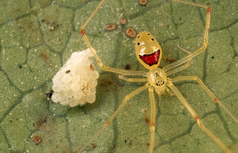 العنكبوت الذي يعيش في جزيرة هاواي و هو المعروف باسم “العنكبوت سعيد الوجه “. وموطنه في غابات الأمطار الإستوائية المحلية لهاواي و النقوش التي رسمت على بطنه تشير بالفعل الى انه مبتسم او يبدو مبتسما.. لكن للأسف هذ النوع من العناكب أصبح مهددا بالإنقراض , وتقريباً له 10أنماط من الأوجه.