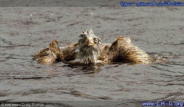 التقطت هذه الصور المذهلة لأنثى حدأة حمراء (أحد أنواع الصقور الجارحة) وهي يعتريها التعب والإرهاق والأكثر من ذلك الصدمة الكبيرة جراء الضرب المبرح الذي تلقته وهي تسبح لتصل إلى الشاطئ لكي تجفف نفسها وهي تلتقط أنفاسها. بدأت الحكاية عندما أخطأت الحدأة في حسابها لهجمتها وإنقضاضها على إحدى فرائسها في إحدى بحيرات محمية “نانت أريان \ Nant yr Arian” في غرب ويلز في بريطانيا وأصابت المياه التي غطتها بالكامل حيث إستغلت أوزة وجود الحدأة في المياة وأنقضت عليها بالضرب والركل لكي تحمي عشها القريب من مكان وقوعها. ولقد تم بعد ذلك سحب هذا الطير المتعب بعد هذه الحادثة من قبل المصور الذي غطى هذا الحدث الغريب حيث قام بتجفيفه وعلاجه وإعادة إطلاقة بصحة جيدة ولكن بالطبع بكرامة مجروحة!!.