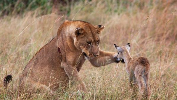 لكن ما أثار استغرابه هو ما تلى ذلك، حيث اكتشفت اللبؤة بعد ساعة تقريباً من اصطياد الظبي الكبير أن هناك ظبي آخر صغير، وقامت بالاقتراب من صغير الظبي على الفور، ولكنها وعلى عكس ما هو متوقع أخذت تداعبه وتتحسس رقبته بهدوء واستكانة، كأنها شعرت بالذنب بعد أن قتلت أم ذلك الصغير.