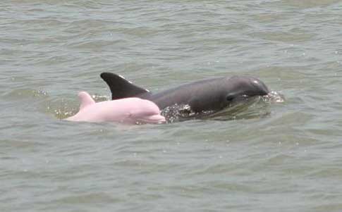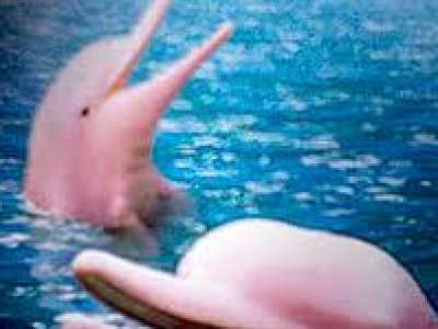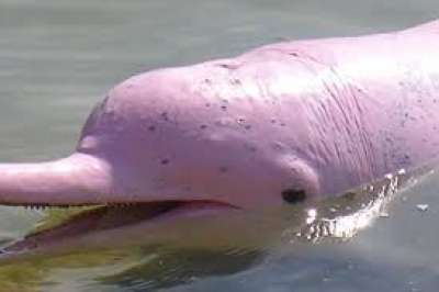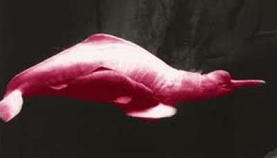 هذا هو الدلفين الوردي الذي يختلف عن الدلفين العادي في كثير من الأشياء حيث يتميز بلونه الجميل الملفت للنظر ومن المعروف انه عند ولادته لا يكون وردياً ولكن يكون رمادياً وعندما يتقدم في السن يأخذ اللون الوردي.
