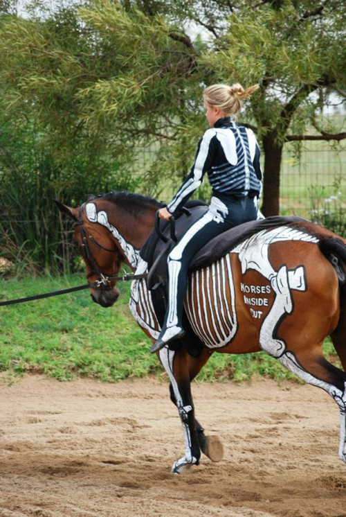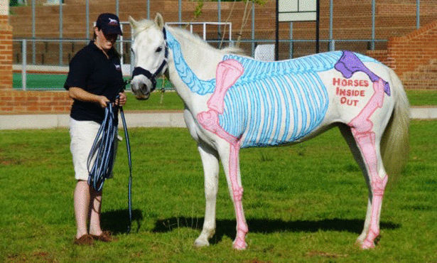 توصلت بطلة سباقات الخيول الإنكليزية "جيليان هيغينز" إلى طريقة جديدة وطريفة لتعليم الطلبة علم التشريح، فقد قامت برسم تكوين الخيول من الداخل على أجساد 4 منها مستخدمة ألوان المياه.