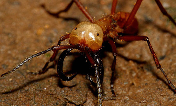 يتواجد هذا النوع من النمل في حوض الأمازون وبعض الدول الآسيوية والأفريقية، ويصل طوله إلى نصف بوصة ولديه أسنان قاطعة، وهو أعمى تماماً مما يجعل وضع فريسته سيئاً عندما يهاجمها، وقد تم تسمية هذا النوع من النمل بالجنود، حيث أنهم لا يقيمون في خلية واحدة بشكل دائم يل إنهم متنقلون بتنظيم مثل الجنود، ويكون هدفهم الأول هو البحث عن الطعام (أي شيء متحرك) بالإضافة إلى توفير المكان المناسب للملكة لكي تنتج بيضها الذي يفقس جنوداً آخرين، وما يجعلهم من أشرس الحشرات هو قدرتهم على الإيقاع بأي كائن حي متحرك مهما كان حجمه من خلال القرض بأسنانهم القاطعة، فنحن هنا لسنا أمام سم قاتل بل أمام حشرات عمياء مفترسة.