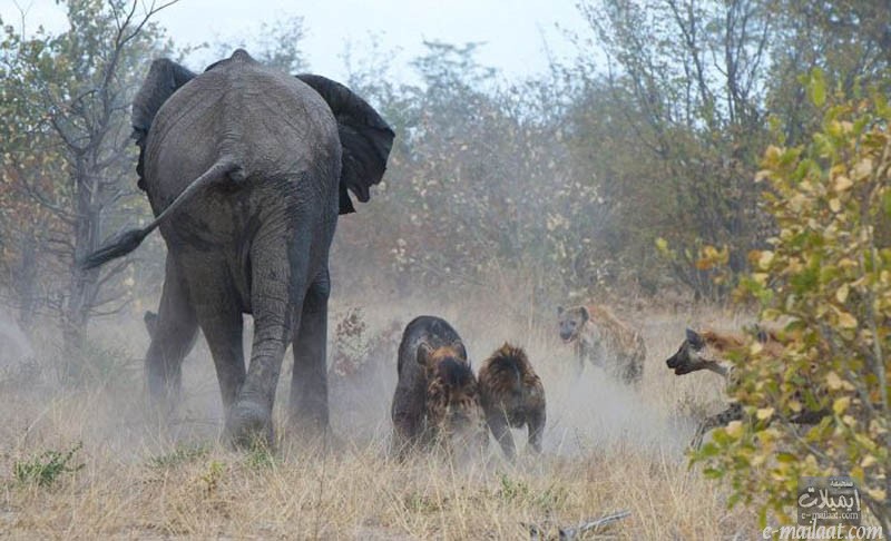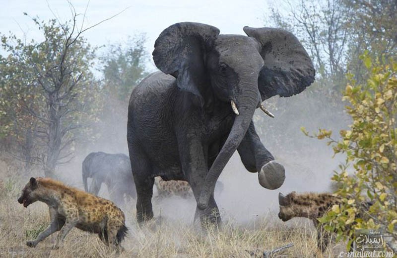يقول احد المصورين ان انثى الفيل ركلت احدى الضباع حتى طار بعيدا في الهواء مما جعل الاخرين يبتعدون عن صغيرها خوف ان يكون مصيرهم مماثل
