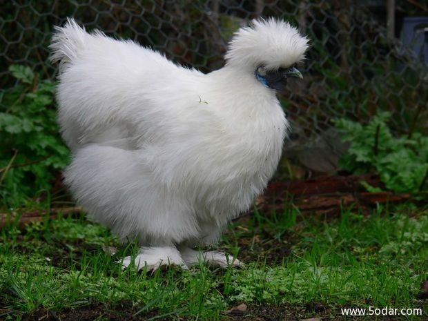 دجاج سلكي (Silkie) وهي سلالة غريبة من الدجاج، والتي تتميز بريش أبيض جميل وحريري،