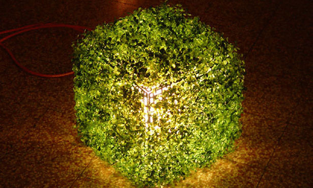 مصباح مصنع بالكامل من المواد المعاد استخدامها والمغطاة بالزرع الأخضر.