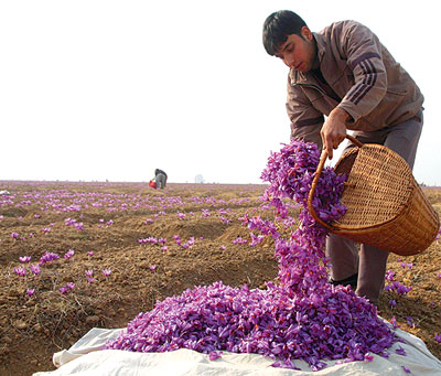استخراجـــــــــه : يستخرج الزعفران من زهرة صغيرة يوجد في قلبها خيوط الزعفران ويتم استخراجها وتجميعها بدقة متناهية وبأيدي أشخاص ذو خبرة وفن في التقاطها وتجميعها وتنزع من الزهور المتفتحة ، وتجفف في الظل ثم على شبكة رفيعة أو دقيقة على نار هادئة وتحفظ في أوان محكمة لكي لا تفقد قيمتها كمادة ثمينة.