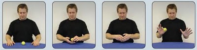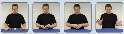 4-الإمساك: إمسك بالجسم الذي تحتاجه باليد المناسبة ( قام تيلر بتعديل أكمام سترته و بدل مكان الكرة سرا من يده اليسرى إلى يده اليمنى دون ملاحظة الجمهور و هو إعلام حركي مرة أخرى).