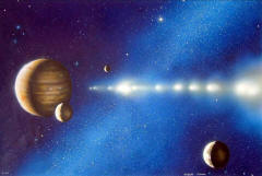 و لسنا نعرف حجم الكون لكننا نعلم أن المجرات يبتعد بعضها عن بعض بسرعات عظيمة . فالكون إذاً يتمدد كمنطاد ينتفخ . و يعتقد كثير من الفلكيين أن هذا التمدد مستمر منذ نشأة الكون ربما قبل سبعة آلاف مليون سنة ، و قد تكونت النجوم و الكواكب السيارة ببطء شديد . و النجم يطلق ضوءاً و حرارة لمدى ملايين السنين ثم يخفت ضوءه و يحتضر ، و في الوقت نفسه تتكون نجوم أخرى من السحب الغازية .