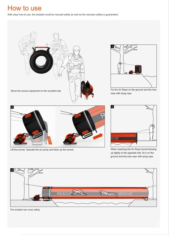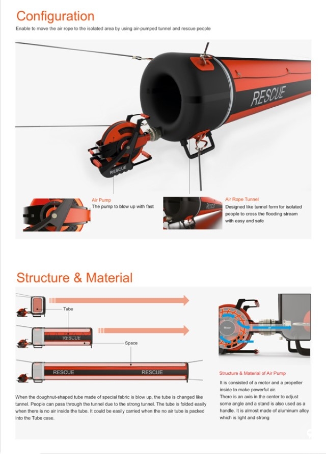 هذا الجسر أو النفق الهوائي يمكن نفخه واستخدامه في حالات الطوارئ عند حدوث السيول أو الفيضانات لإنقاذ الناس الذين حاصرتهم المياه، وقد نال هذا التصميم جائزة "ريد دوت" للتصاميم لعام 2013