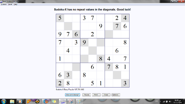 او يمكنه ان يرفع الصعوبة بتطبيق السودوكو أكس حيث لا يمكن ان تتكرر القيم ضمن القطرين أيضا