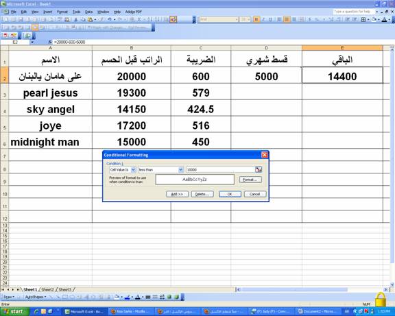 10000 في العمود E اي خلية تكون القيمة تبعها أقل من 10000 ليرة رح يتحول لونها للأحمر تلقائياً