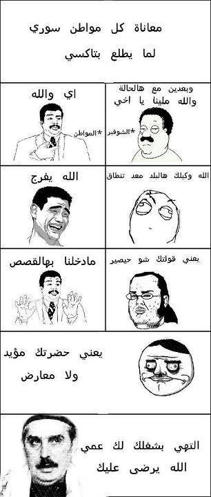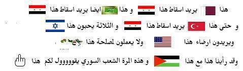 بدي اشكر المعارضة السورية من كل قلبي لانو.. . . . . . . اول مرة ببكي بس اسمع النشيد السوري... اول مرة بتخانق مع اعز رفقاتي كرمال وطني ... اول مرة بهتف من قلبي الله سوريا بشار بس ... اول مرة بعرف انو في بالجيش اسمو وحدات الهندسة وانو ممكن يموتو بأي لحظة ... اول مرة بعرف انو كل شي بينشرى بالمصاري الا الكرامة... اول مرة بيخطرلي قول لجندي سوري الله يحميك ... اول مرة ما بتذمر من قطع الكهربا وبقول فداك يا وطن ... اول مرة بضم العلم السوري من كل قلبي وببكي