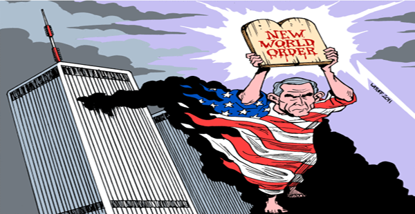 ومن جهته، قام الرسام البرازيلي كارلوس لاتوف – من أصل لبناني- برسم صورة كاريكاتيرية جديدة بمناسبة ذكرى الحادي عشر من سبتمبر وهي تصور الرئيس السابق للولايات المتحدة جورج بوش وهو ملتف بالعلم الأمريكي طائرا مع الضباب الدخاني الذي تسببت فيه الهجمات رافعا لوحة مكتوب عليها “النظام العالمي الجديد”.
