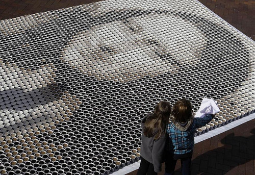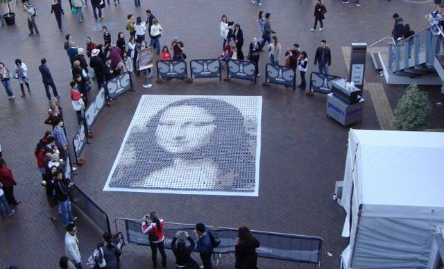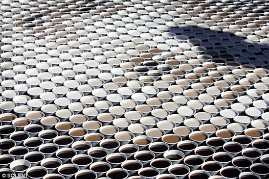 Artist assistants stand next to 3,604 cups of coffee which have been made into a giant Mona Lisa in Sydney , Australia . The 3,604 cups of coffee were each filled with different amounts of milk to create the different shades