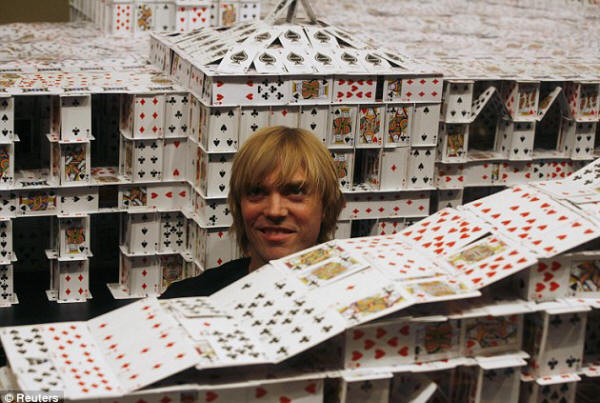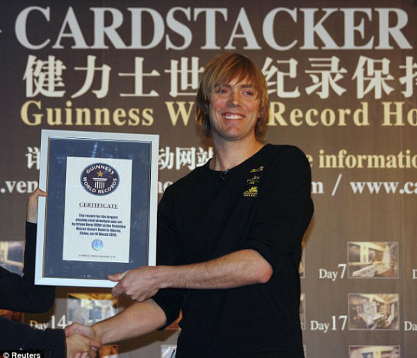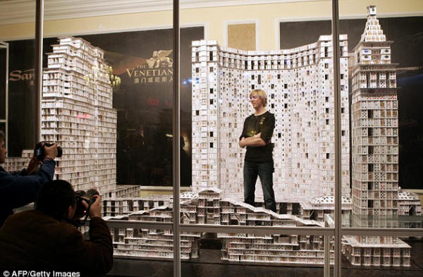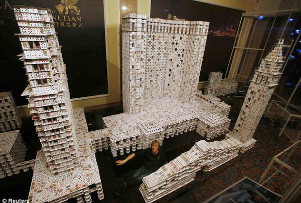 استطاع مهندس معماري امريكي تحطيم رقم قياسي عالمي من خلال استعمال اوراق الكوتشينة لتشييد هذا البناء العملاق ..وقد استخدم الامريكي براين بريج ما يقارب 220 الف ورقة كوتشينة وايام عمل بلغت 44 يوما لانهاء المبنى ..وكان الرقم القياسي السابق مسجلا ايضا باسمه لكن عدد الاوراق كان اقل المبنى الجديد يبلغ طوله 10 امتار وارتفاعه 3 امتار ووزنه 272 كيلوغرام