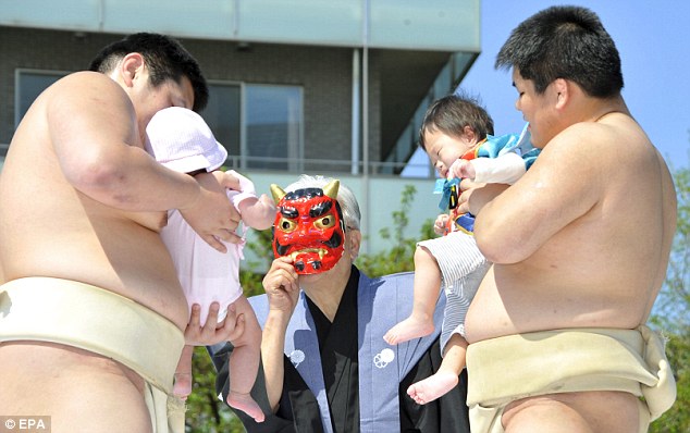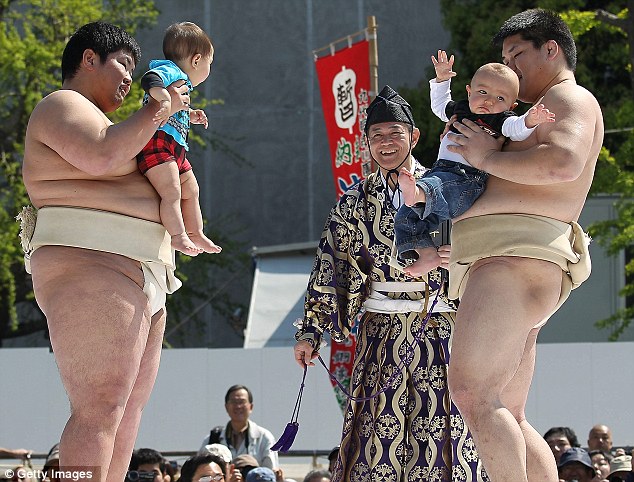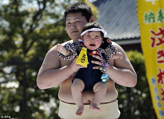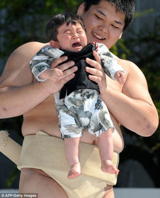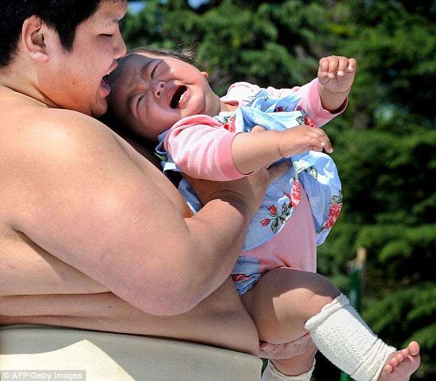 امهات يابانيات يحضرن اطفالهن للمشاركة في مسابقة الطفل صاحب صوت البكاء الاعلى .. ويعتبر بكاء الاطفال في اليابان دليل على الصحة ويساعد في نمو الطفل .. اما كيف يجبر الاطفال على البكاء فمشهد مصارعي السومو المرعب يجعل الطفل يبكي بدون انقطاع